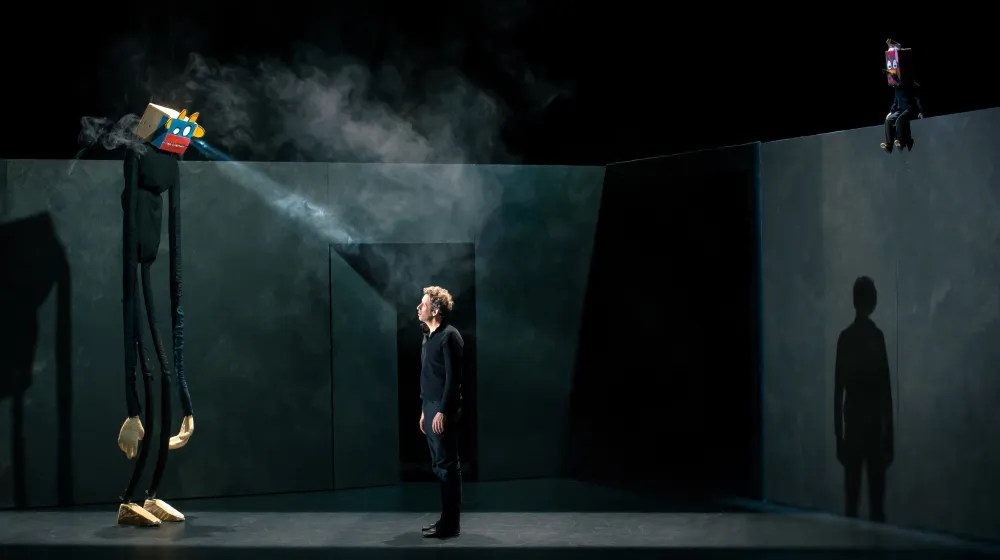 En répétitions est arrivée la figure de la marionnette. Elle a d’abord été signifiée par des objets : deux bâtons, des vêtements, comme un mannequin. Je ne sais pas si c’est ce désir, mais à un moment donné s’est cristallisée en moi l’idée que peut-être je pourrais endosser ce rôle-là et faire prendre l’espace à cette marionnette devenue vivante.