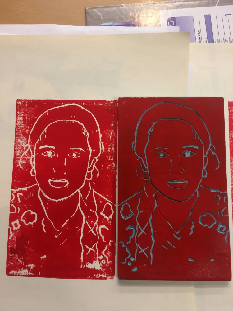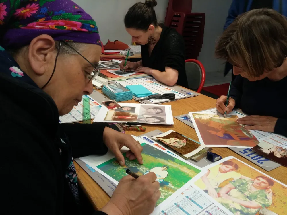 « Elles sont là, elles nous attendent. Plusieurs femmes réunies par Sok-Ay dans le petit local de Loisirs Tout Azimut ont apporté à ma demande des photos soustraites à leurs albums familiaux. Les images datent des années 80. Certaines sont très belleset paraissent d’un autre temps, celui où les selfies n’existaient pas, où l’on posait de manière différente, où chaque photo prise était précieuse et l’instant, choisi. À partir de ces photos,elles vont se mettre à graver et à raconter…
