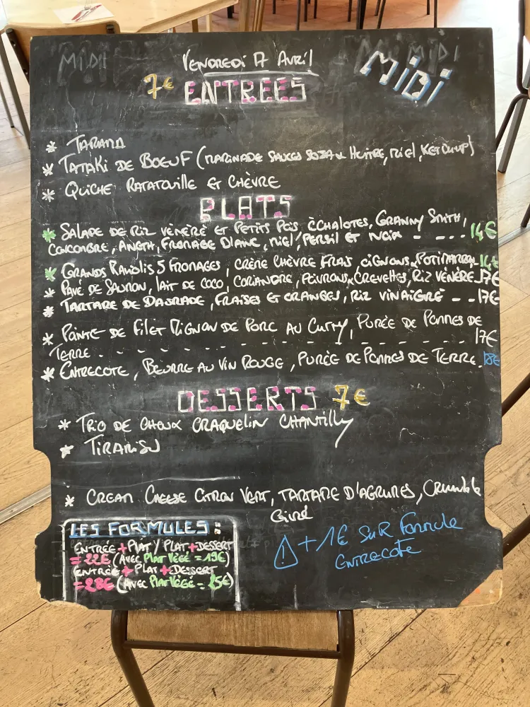 Côté restauration, des produits frais, une cuisine à l'ardoise, un plat végétarien par jour. Côté bar, des bières Demory brassées en Seine-Saint-Denis, les boissons artisanales et bios UMÀ provenant de Pantin, et une sélection de vins bios.